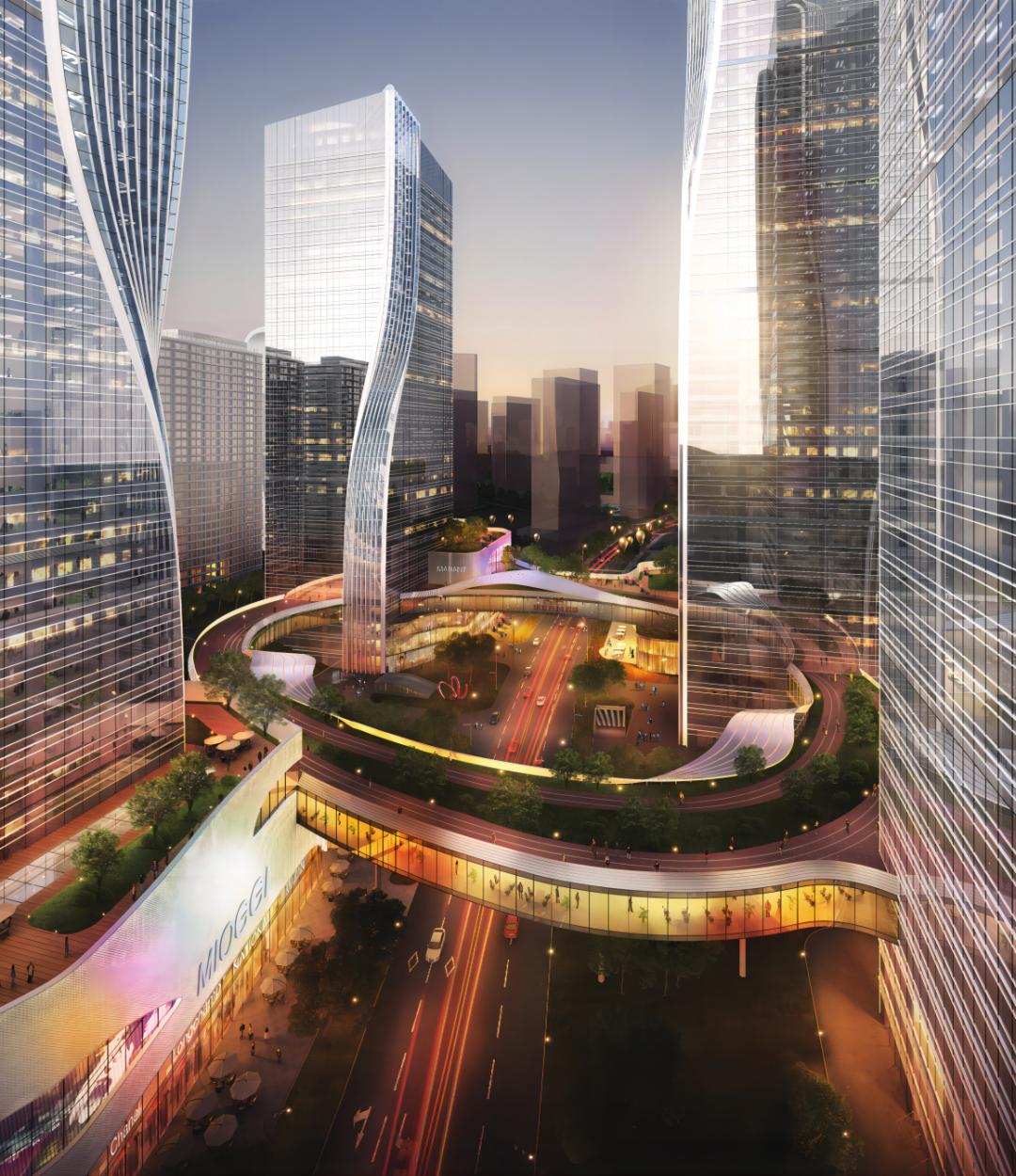 Kompleks menara kembar ini mencakup 57 hektar dengan total luas lantai 220.000 meter persegi, mengintegrasikan kantor, hotel, ritel, makan, dan hiburan. Dinding tirai kaca, dihiasi dengan lebih dari 7.200 meter strip cahaya yang disinkronkan, membuat pola dinamis di hampir 11.000 meter persegi, memberikan dampak visual yang kuat.