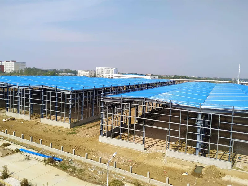 Fleksibilitas Tinggi: Badan utama bangunan pabrik struktur baja dirakit dengan komponen baja, menampilkan fleksibilitas yang kuat dan ruang internal yang besar.